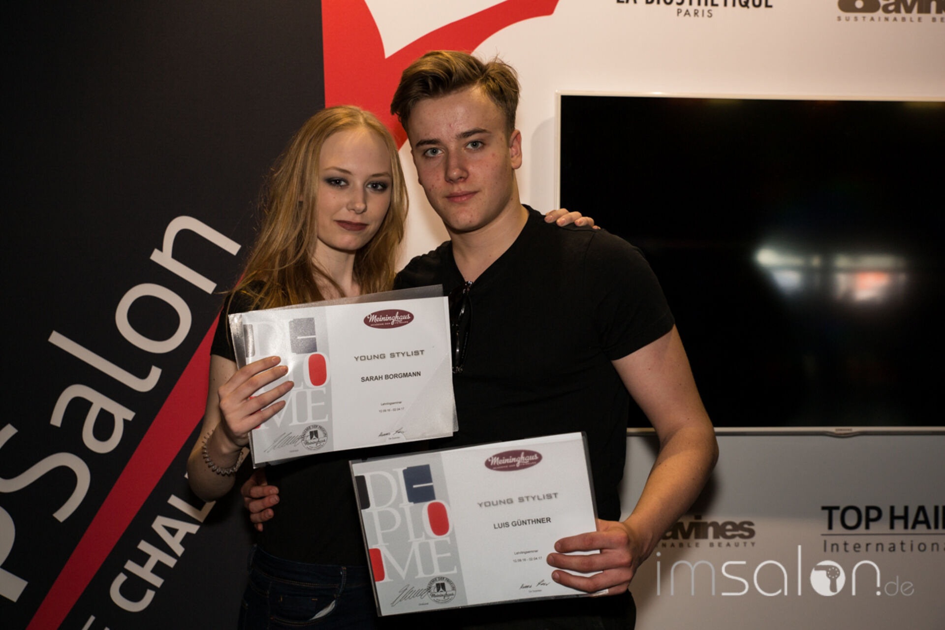 ►Axel Meininghaus, Gründer und Betreiber der Meininghaus Akademie der Friseure in Forchheim ehrt seine Auszubildenden auf der Wokshopbühne der TOP HAIR Messe und überreicht ihnen die Zertifikate zur bestandenen siebenmonatigen Ausbildung.