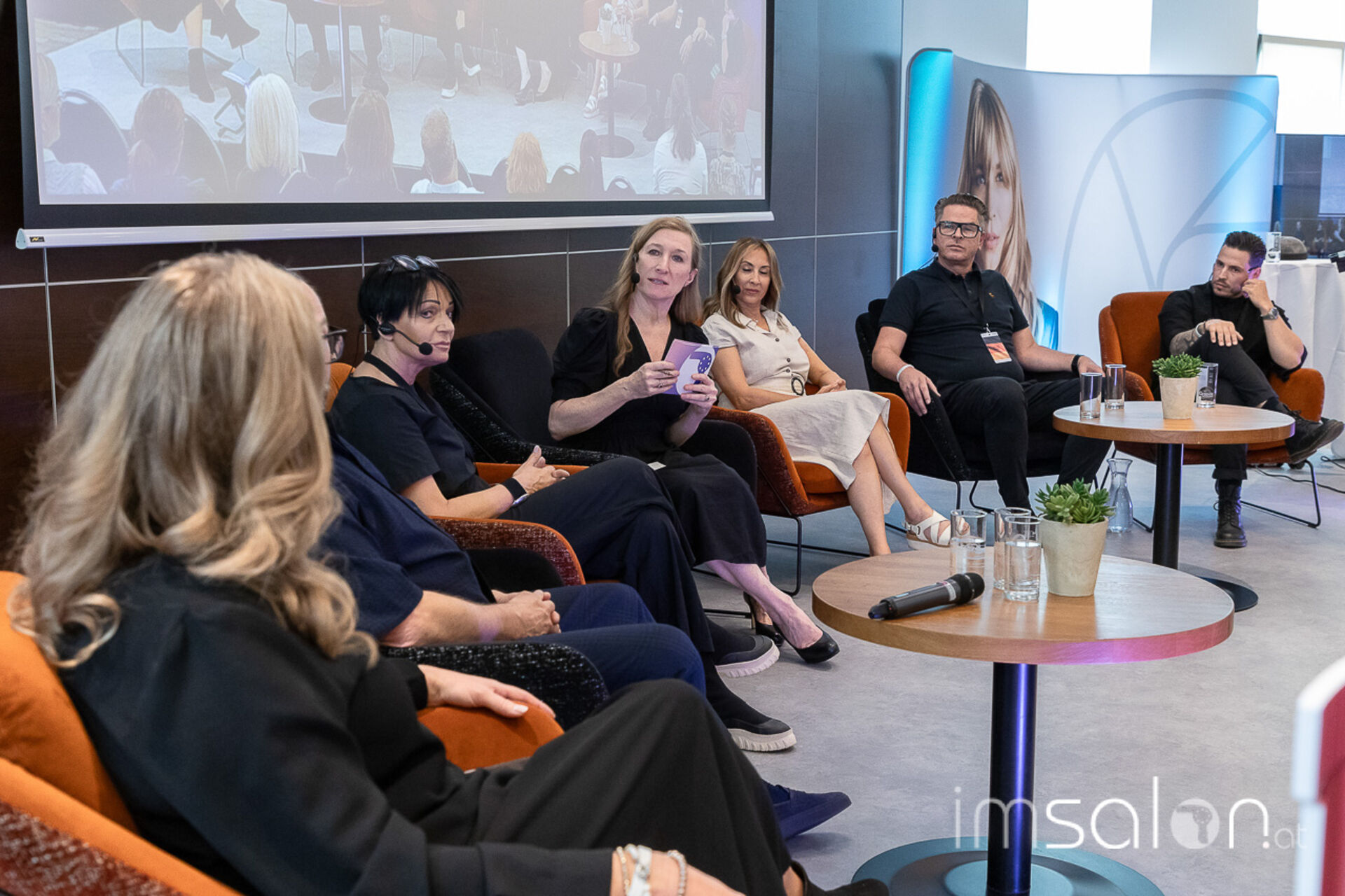 Die große Frage ganz zum Schluss: Alles klasse, aber Wie setze ich es im Salon um? Das wurde auf der Bühne moderiert von Raphaela Kirschnick mit Edith Laicha, Jürgen Ressel, Sibille Griessner, Philipp Seethaler, Sonja Thale, Mario Krankl diskutiert unter Einbeziehung des Publikums.