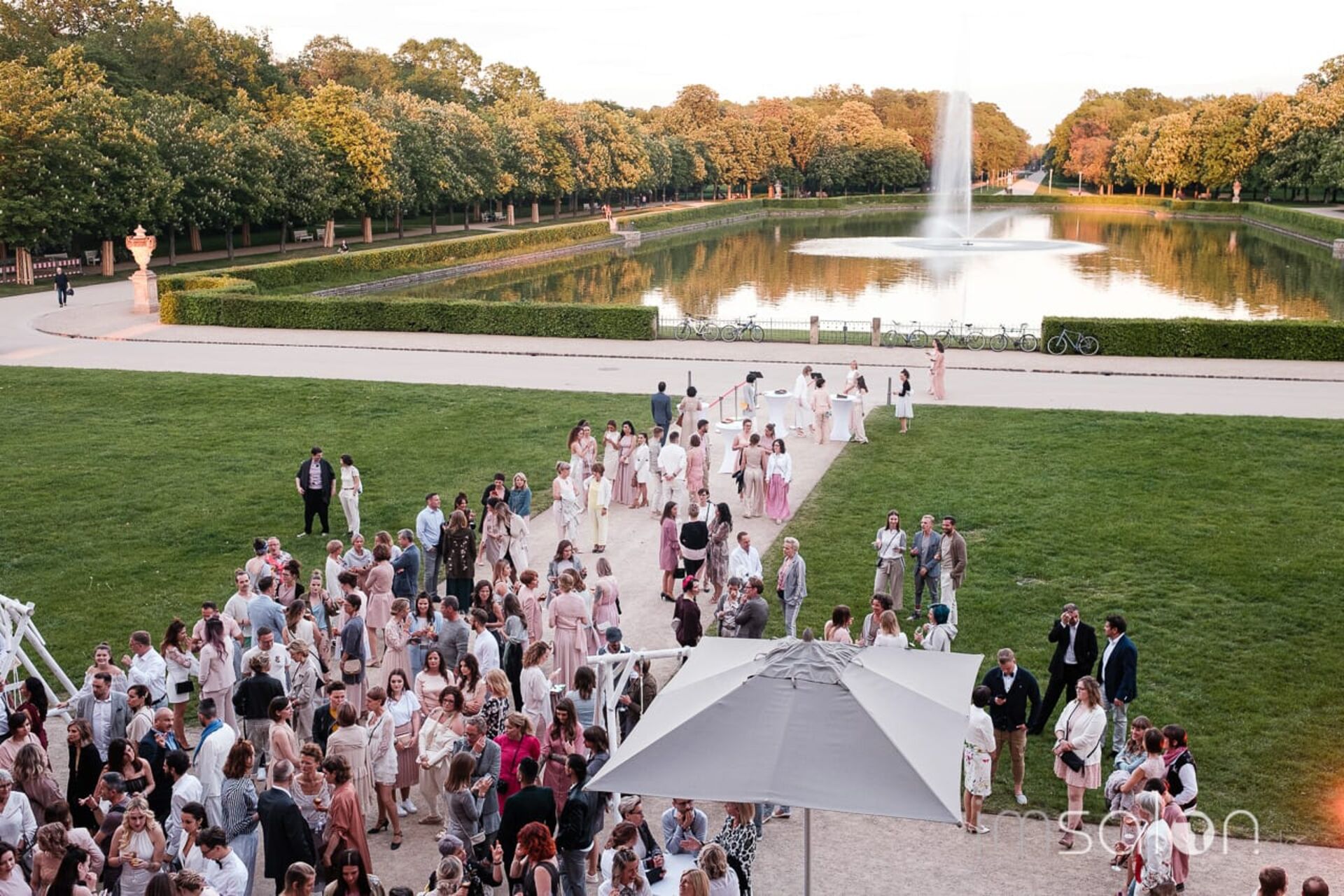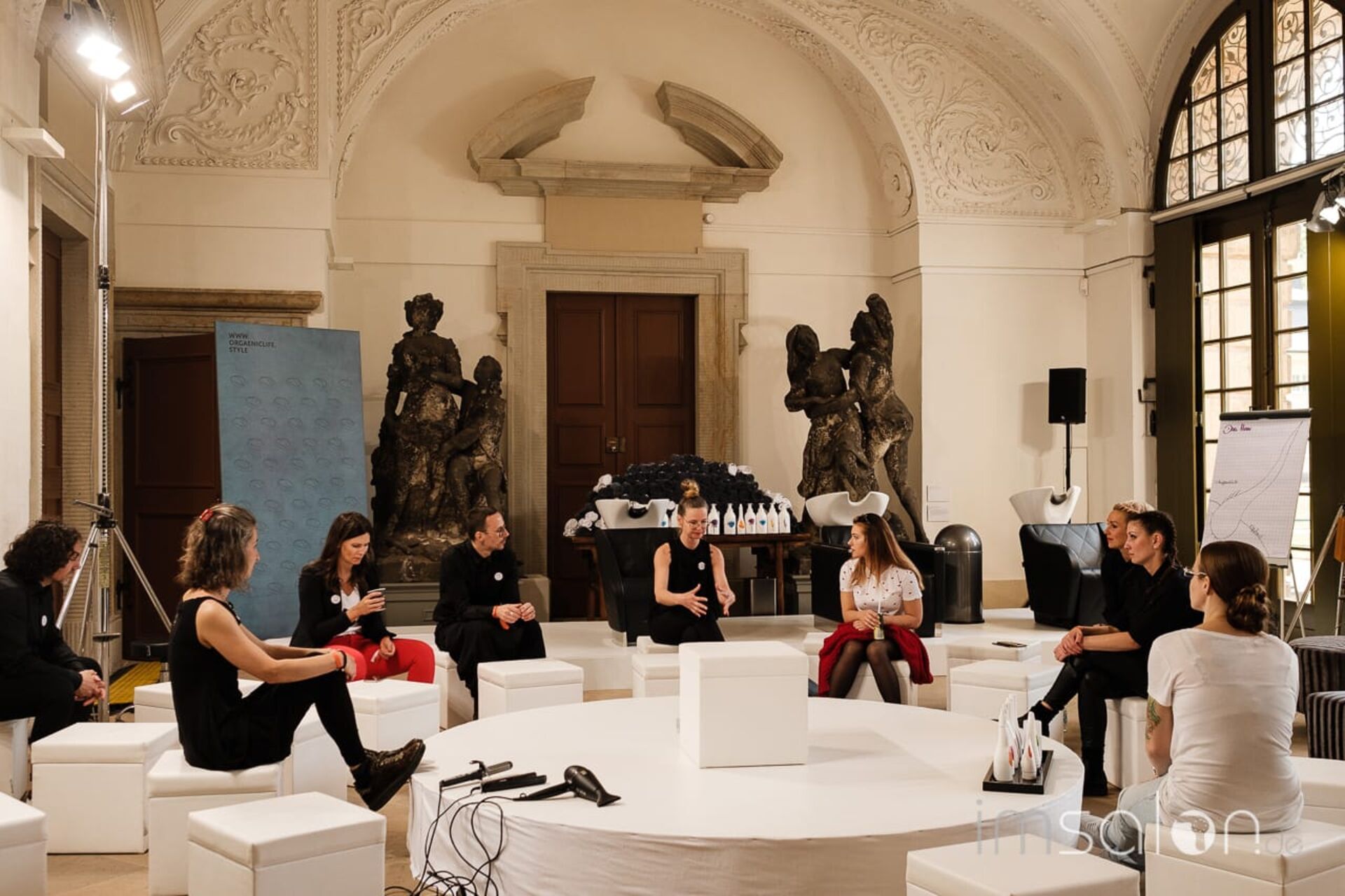 Man nehme ein sonnenbeschienenes Palais in einem prachtvollen Garten und drappiere unter imposantem Kreuzgewölbe weiße, wallende Stoffbanden als Raumteiler, runde Workshopbühnen mit Mega Screens und chillige Lounges. Im Vestibül des barocken Lustschlosses vereint man gekonnt Marketing, Markenbildung und Shopping Area, im zweiten Stock gelebtes Wissen mit hautnahen Workshops.