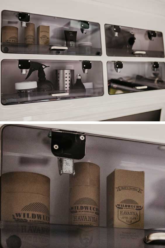 Der vormalige Krankentransporter, der gemeinsam mit fleißigen Helfern umgebaut wurde, ist ein perfekter kleiner Salon, mit einem Frisierstuhl, einem Waschbecken mit Wassertank, Ladestationen, Ablagen und Fächern etc.
